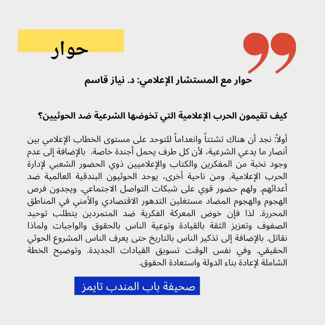 حوار مع المستشار الإعلامي: د. نياز قاسم حول تقييم الحرب الإعلامية التي تشنها الشرعية اليمنية ضد الحوثيين؟ حوار مع المستشار الإعلامي: د. نياز قاسم حول تقييم الحرب الإعلامية التي تشنها الشرعية اليمنية ضد الحوثيين؟ ديسمبر 17, 2024 | إنفوغرافيك, باب المندب and سياسية