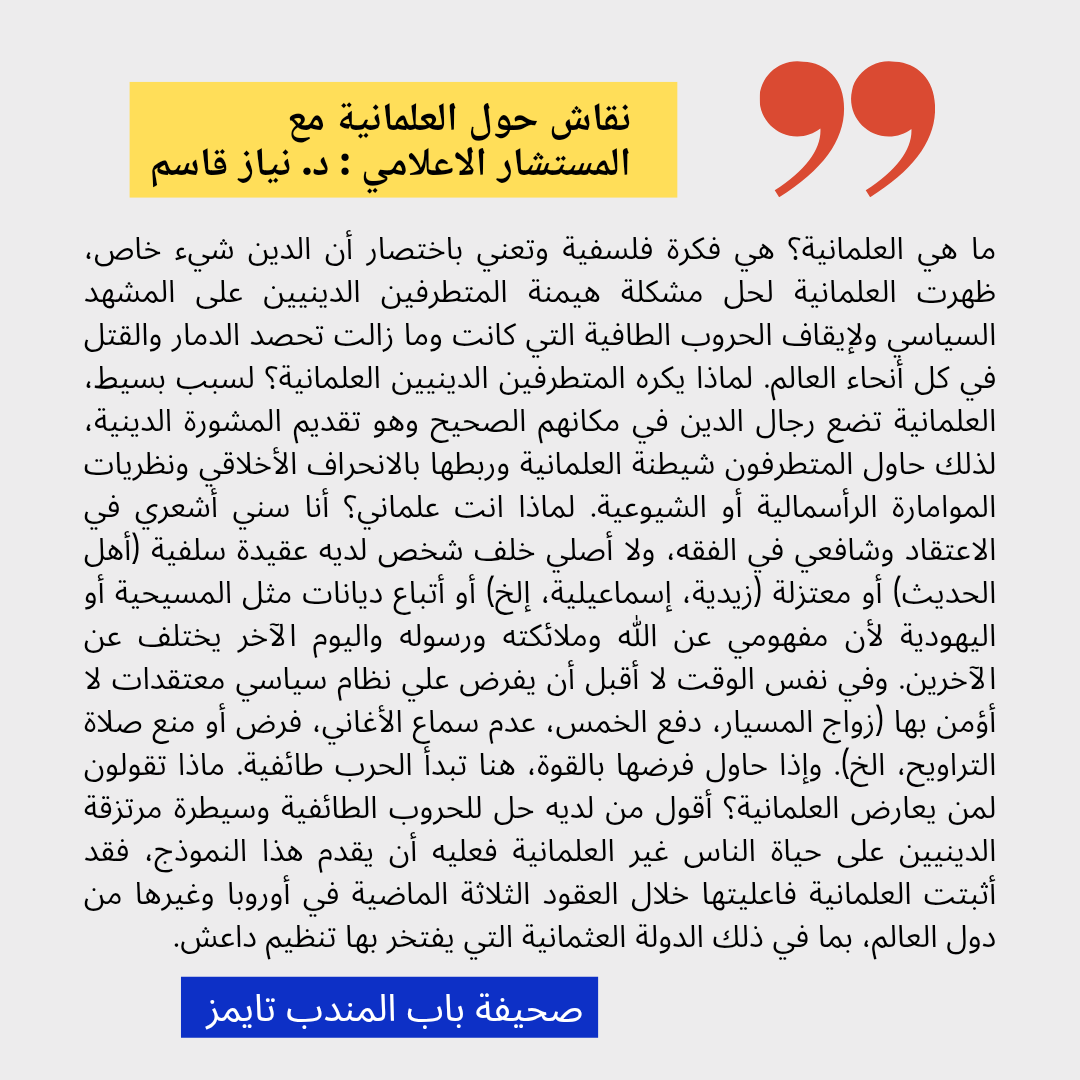حوار مع المستشار الإعلامي: د. نياز قاسم حول تقييم الحرب الإعلامية التي تشنها الشرعية اليمنية ضد الحوثيين؟ حوار مع المستشار الإعلامي: د. نياز قاسم حول تقييم الحرب الإعلامية التي تشنها الشرعية اليمنية ضد الحوثيين؟ ديسمبر 17, 2024 | إنفوغرافيك, باب المندب and سياسية
